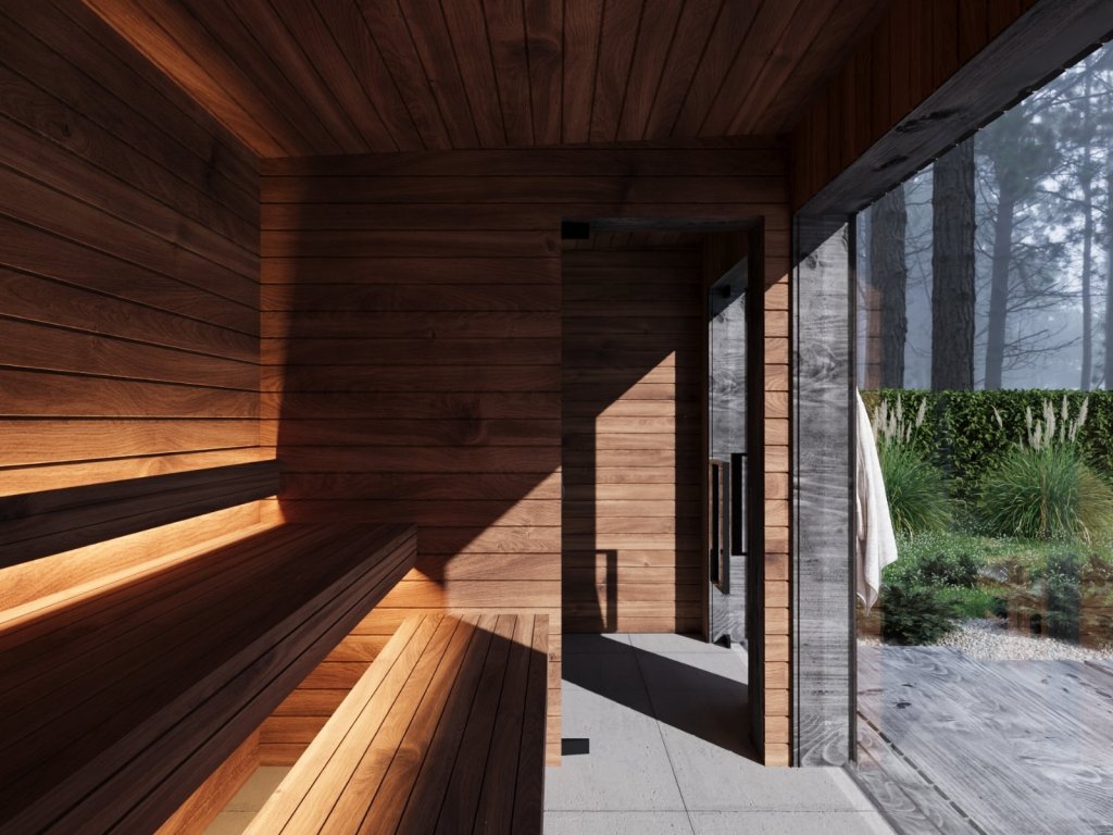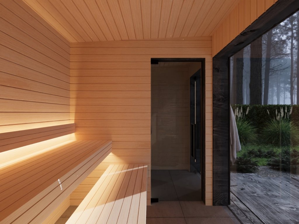 Vnitřní rozměry sauny: 180 x 210cm, relaxační místnosti: 180 x 160cm